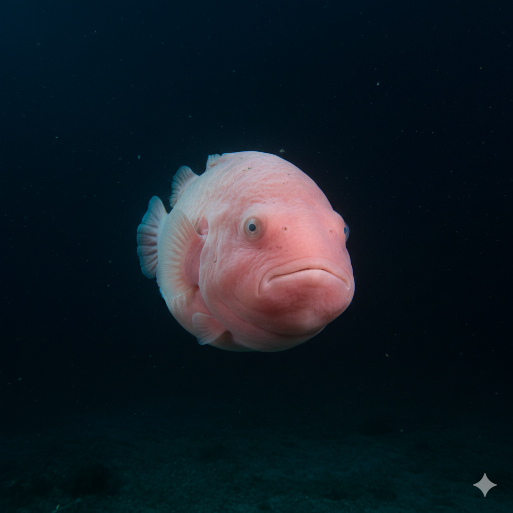 Na natureza, ele vive entre 600 e 1200 metros de profundidade, onde a pressão é esmagadora. Lá embaixo, ele parece um peixe normal. Como ele não tem bexiga natatória (que explodiria na pressão) e tem poucos músculos, sua carne é uma gelatina ligeiramente menos densa que a água, permitindo que ele flutue sem gastar energia. Trazê-lo para a superfície é o que o deforma. Basicamente, estamos julgando a aparência dele depois que ele “explodiu”.